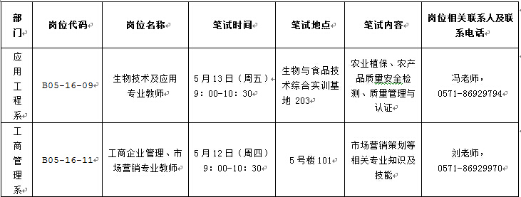 应用工程系生物技术及应用专业教师(B05-16-09)、工商管理系工商企业管理、市场营销专业教师(B05-16-11)因通过资格审查人数较多,按照公告要求,须先行进行笔试,根据考生笔试成绩高低,按计划5:1的比例进入试讲环节。考生笔试、试讲成绩30%、40%加总后,根据加总分数高低,按计划3:1的比例进入面试环节。笔试、试讲和面试分别则按30%、40%、30%计入总成绩。